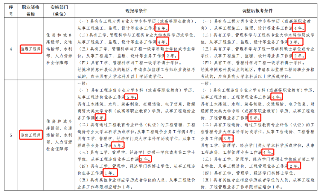 變化:取消了畢業后的總工作年限要求,除了碩士學歷外,其他學歷從事工程類工作年限不變,總體還是降低了要求的。