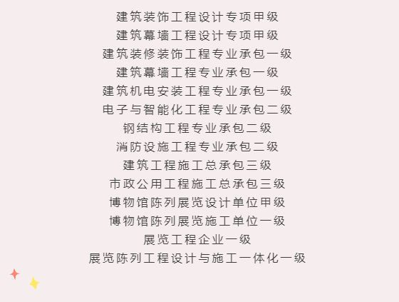 近期,深圳千里馬裝飾集團資質建設喜訊頻傳,集團陸續取得了“建筑工程施工總承包三級”、“市政公用工程施工總承包三級”、“消防設施工程專業承包二級”、“博物館展陳設計甲級與施工一級”等多項資質。資質的全面升級,意味著集團資質體系的逐漸完善。